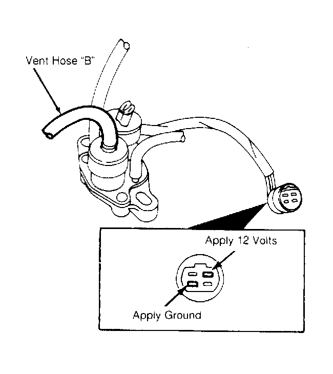 Disconnect vacuum hoses and solenoid valve connection. Blow through vent hose "B" and verify that air flows. Apply 12 volts and ground the connector. See Fig 1 . Blow through the vent hose and ensure air does not flow. Replace EGR control solenoid valve if necessary.