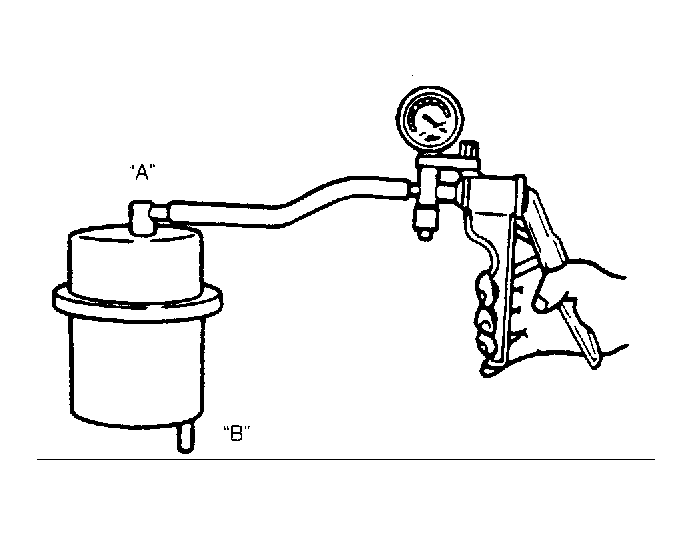 Remove vacuum reservoir hoses. Using a vacuum pump, apply vacuum at port "A" and ensure vacuum is not held. See Fig 1 . Apply vacuum at "B" and ensure vacuum is held. Replace vacuum reservoir if necessary.