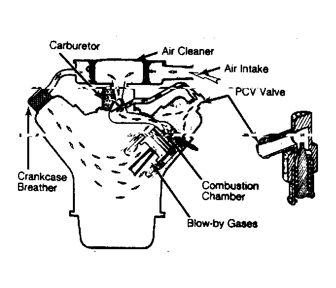 Entering fresh air combines with blow-by gases and unburned air/fuel mixture of the crankcase. Combined gases are drawn into the intake manifold, through the PCV valve, by manifold vacuum. Crankcase gases mix with air/fuel mixture and are burned in the combustion chamber. See Fig 1 .
