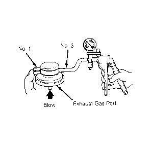 Remove transducer from vehicle. Plug port No. 1. See Fig 1 . Blow into exhaust gas port while applying vacuum to port No. 3, ensure vacuum is held. Release exhaust gas port and ensure vacuum is released. Replace EGR backpressure variable transducer if necessary.