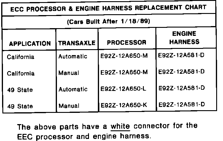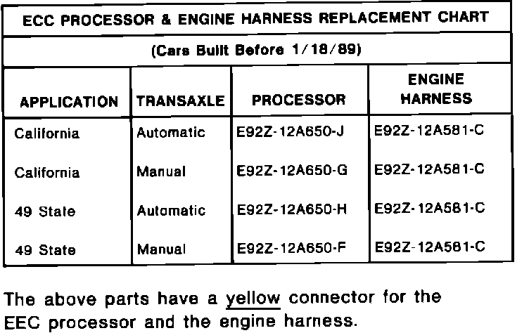 ISSUE: Cars built after 1/18/89 have different EEC processors and engine harnesses than cars built before 1/18/89. The two