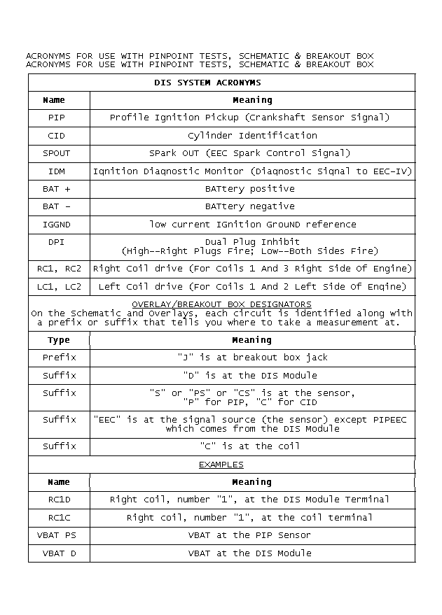 Use the following FAULT-TO-ACTION to determine the appropriate pinpoint check to use. For reference, be sure to use the Fig 1 ACRONYMS FOR USE WITH PINPOINT TESTS, SCHEMATIC & BREAKOUT BOX TABLE with the pinpoint checks.