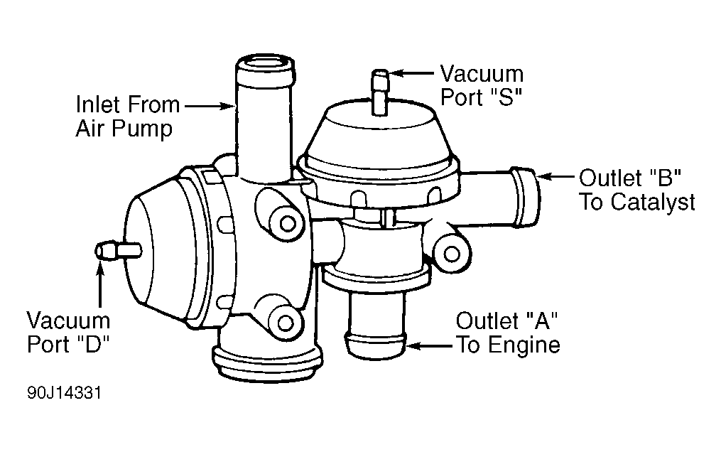 - Reconnect vacuum line to port "D". Disconnect and plug vacuum line to port "S". Ensure vacuum is present in line to vacuum port "D". Accelerate engine to 1500 RPM. Airflow should be noted coming out of outlet "B". No airflow should be detected at outlet "A".