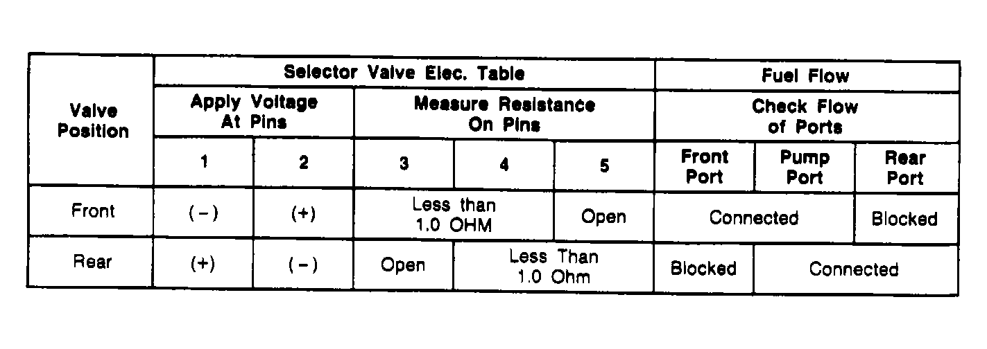 Remove fuel selector valve. Perform checks as indicated in fuel selector valve specification table. See Fig 1 . Replace selector valve if operation is not correct.