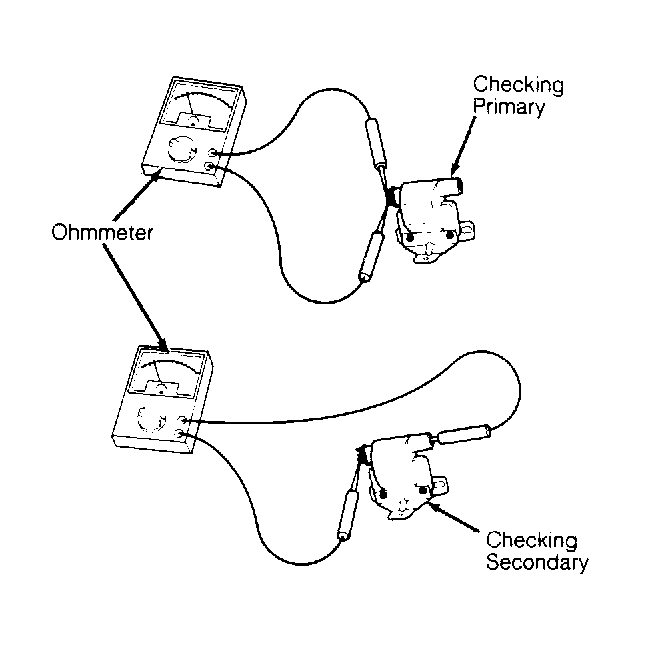 - Inspect coil for signs of arcing or leakage. Remove primary and secondary leads from ignition coil. Using ohmmeter, check primary resistance between (positive) and (negative) terminals of coil. See Fig 1 .