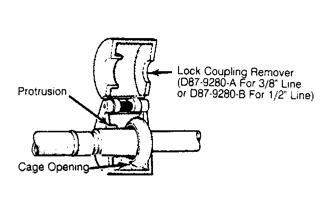 - Using Spring Lock Coupling Remover (D87L-9280-A for 3/8" or D87L-9280-B for 1/2"), remove clip from coupling. Place remover over coupling so intrusion is positioned on cage opening side of coupling. See Figure .
