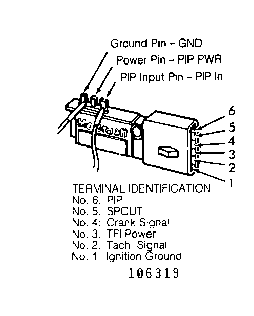 - If spark was not present in step 4), connect original vehicle coil and spark tester. Remove pin-in-line connector located near distributor. Crank engine while checking for spark. If spark is present, inspect PIP and ignition ground circuits to verify continuity. See Fig 2 and Fig 3 . Repair as necessary.