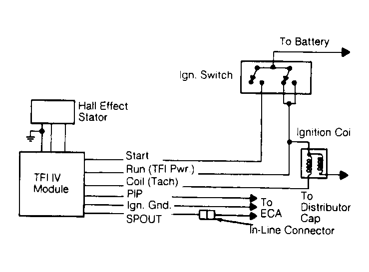 TFI Terminals Ohms GND-PIP More than 500 PIP PWR-PIP IN Less than 2000 PIP PWR-TFI PWR Less than 200 GND-IGN GND Less than 2 PIP IN-PIP Less than 200 - If the TACH light did not blink in step 2), replace TFI module and repeat step 1). If spark is still not present, replace ignition coil and module connector. If the TACH light did blink in step 2), substitute ignition coil with a known working unit and repeat step 1). If spark is present, verify coil secondary wire resistance is greater than 7000 ohms per foot. Replace ignition coil.