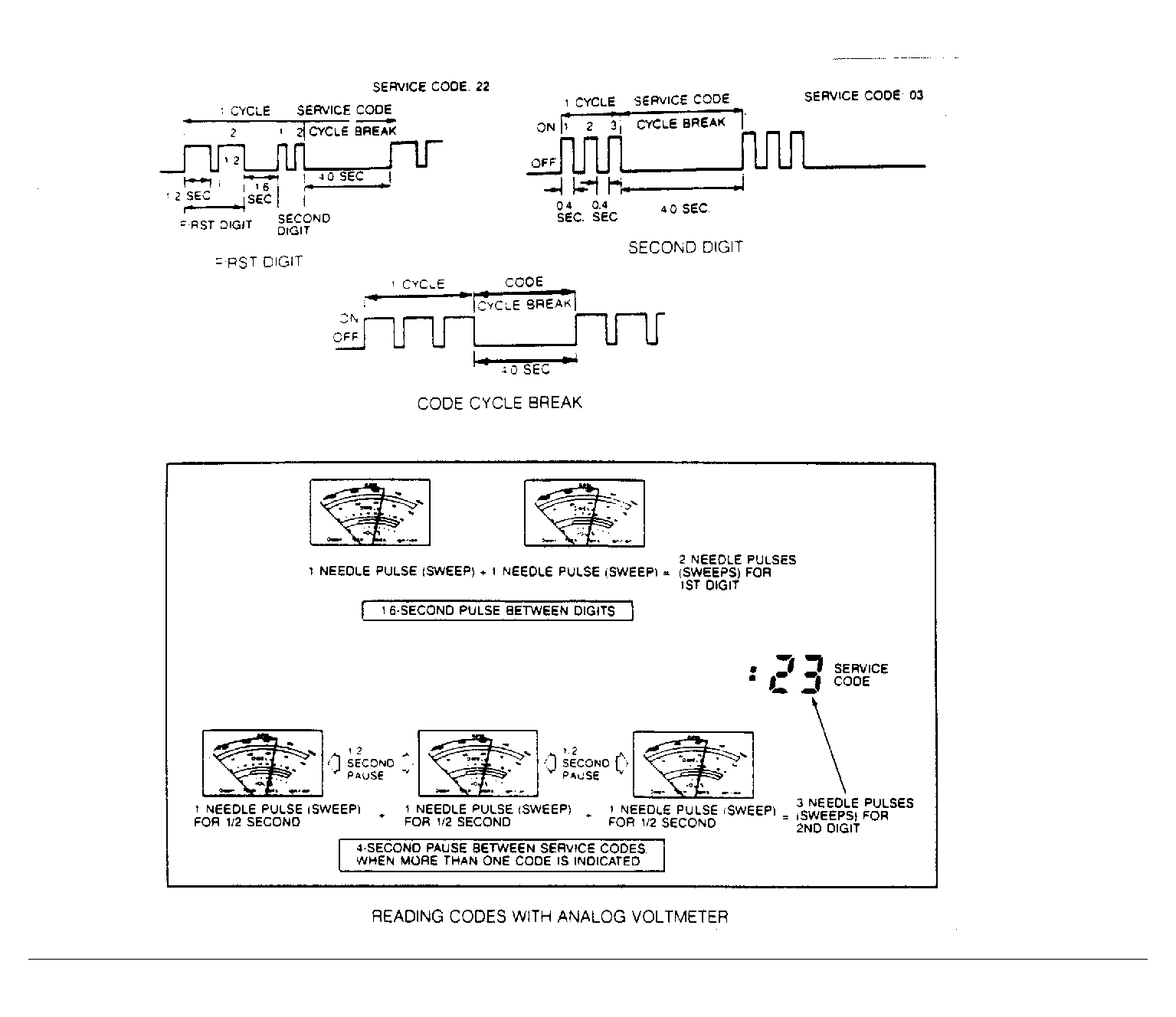If an analog voltmeter or the CHECK ENGINE light is being used, pay careful attention to the length of the pauses between signals in order to read the codes correctly. The first digit in a service code will be indicated by 1.2 second signals separated by a 0.4 second pause. There is a 1.6 second pause between the first digit and second digit. The second digit is indicated by 0.4 second signals separated by 0.4 second pauses. There will be a 4 second pause between each service code.