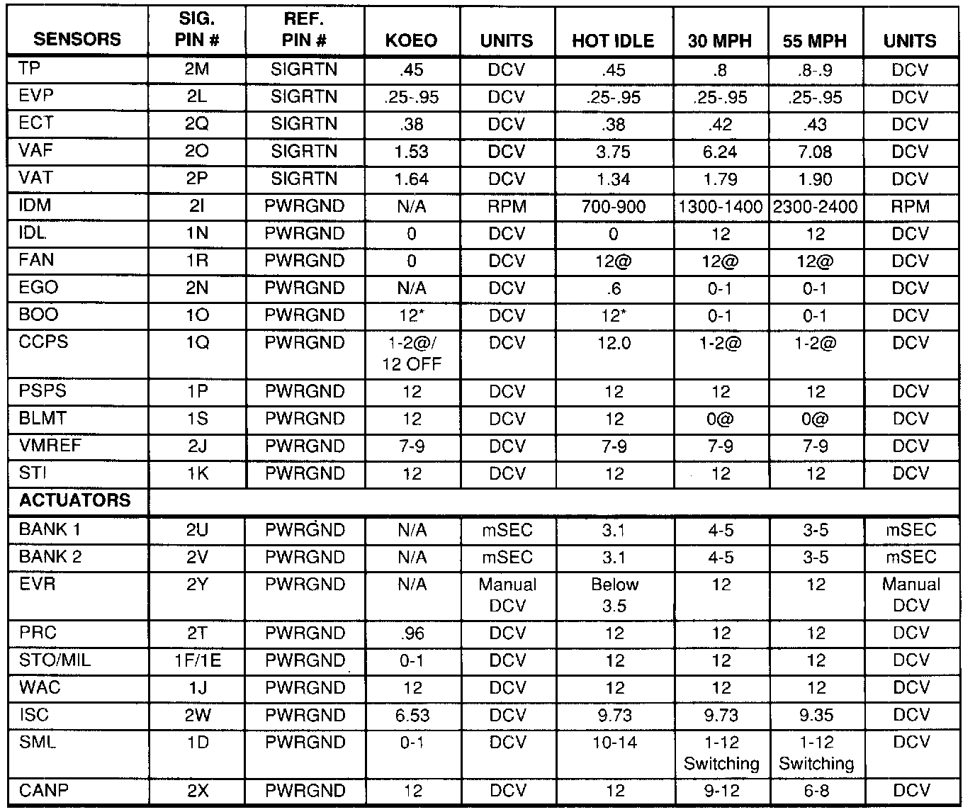 Normal Scan Data Values (Includes PID's)