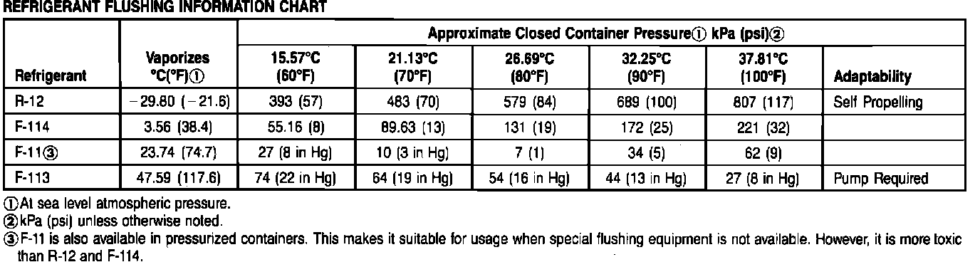 Several refrigerants may be used to flush badly contaminated systems, Fig. 5. For a refrigerant to effectively wash the inside surfaces of components, it must be in liquid state, as vapor will not flush away contaminants. R-12 and F-114 are best suited for flushing without special flushing equipment, as they have greater pressure at ambient temperatures and are the least toxic. However, at higher ambient temperatures, they tend to vaporize and no longer act as proper flushing agents. F-11 and F-113 are better suited for continuous circulation flushing equipment.