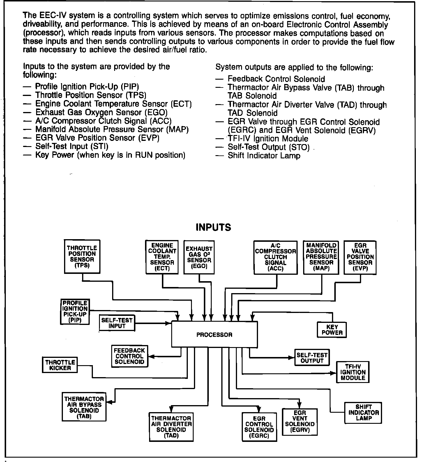 The EEC-IV system also controls exhaust gas recirculation (EGR), A/C compressor cutoff at wide open throttle, knock control to eliminate detonation under adverse driving conditions, and wastegate control which regulates turbocharger boost pressure. The EEC-IV also controls fuel mixture on feedback carbureted engines.