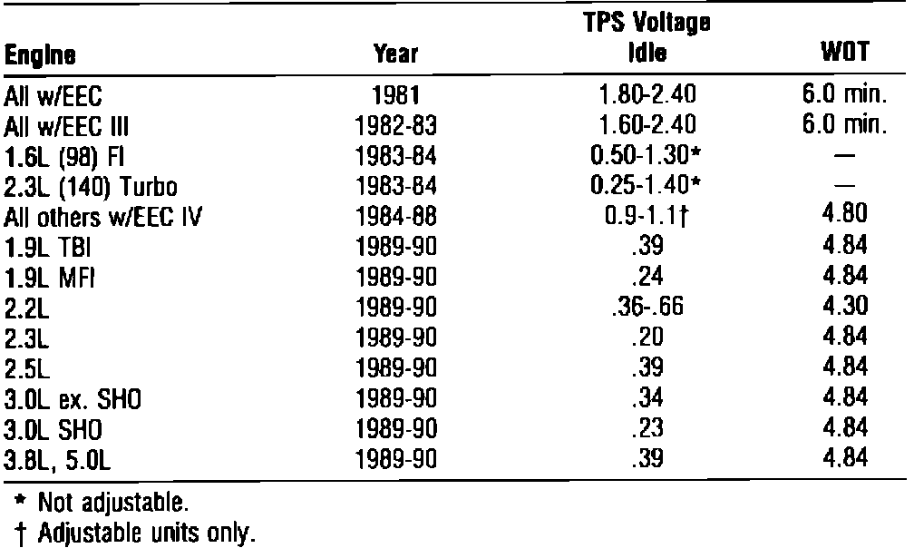 Engines with EEC IV: Connect positive (+) probe of DVOM along the DG/LG wire of TPS. Connect negative (-) probe along the BK/W wire and turn ignition on but do not start engine. Adjust TPS to specified value.