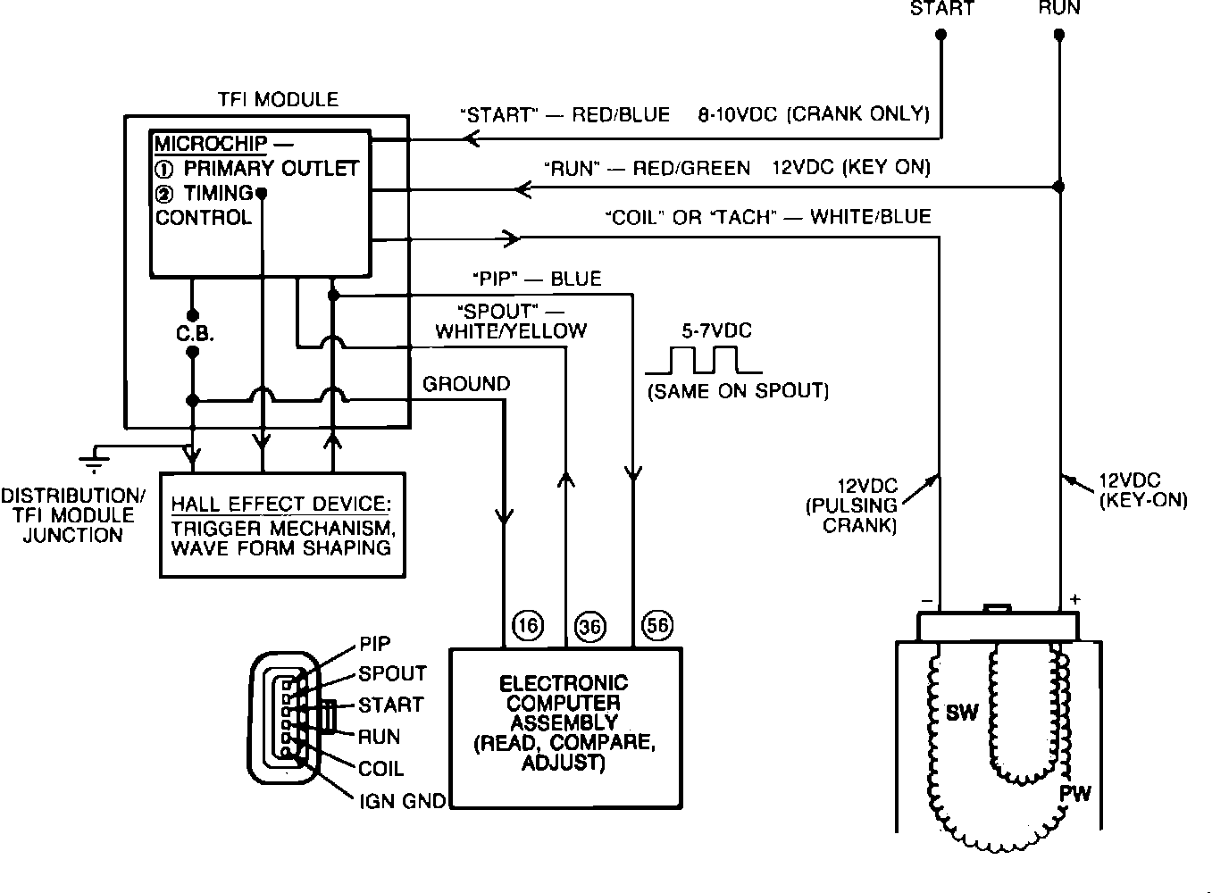 The module supplies the spark to the distributor through the ignition coil and calculates the duration. It receives its control signal from the Electronic Control Assembly (ECA) Spark Output (SPOUT).