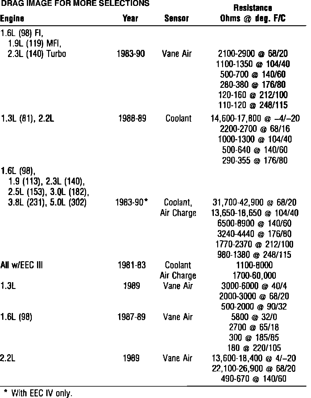 All others with EEC IV VAT: Measured between upper terminal (LG/P wire) of airflow sensor and ground.