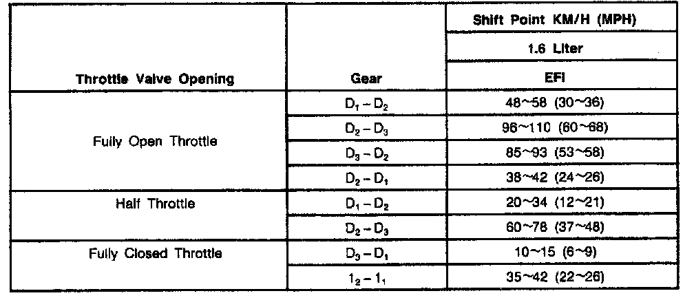 AXOD 4-spd A/T, Shift Speeds (Festiva):