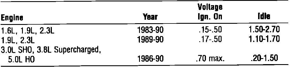 1.6L MFI, 1.9L MFI, 2.3L MFI: Vane Airflow Sensors, measured between second upper terminal (W/BK wire) and ground.
