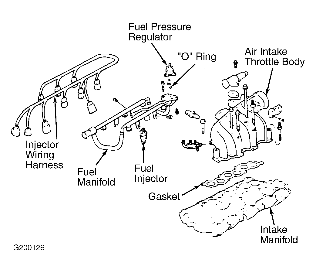 2. Disconnect wiring harness at fuel injectors. See Figure. Disconnect vacuum hose from fuel pressure regulator. Remove fuel assembly manifold bolts (2 on each side). Carefully disengage fuel supply manifold from fuel injectors by lifting and gently rocking rail.