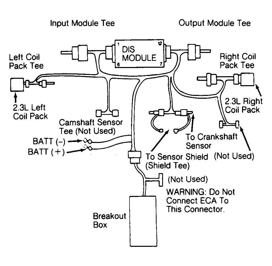 Install DIS diagnostic Cable (007-00044). Connect diagnostic cable to Breakout Box (T83L-50-EEC-IV). See Fig 1. Use 2.3L overlay. Connect LED test light between breakout box pins No. (+) J31 (PIP EEC) and (-) J60 (BAT -). Crank engine. If test light blinks continuously during cranking, go to next test. If test light does not blink continuously during cranking, replace DIS module, and check for fault codes.