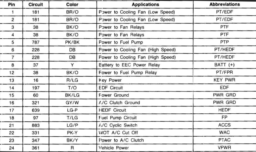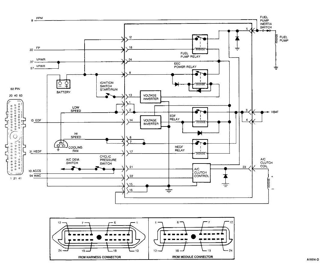 The Integral Relay Control Module (IRCM) interfaces with the EEC-IV processor to provide control of the cooling fan, A/C clutch, and the fuel pump.