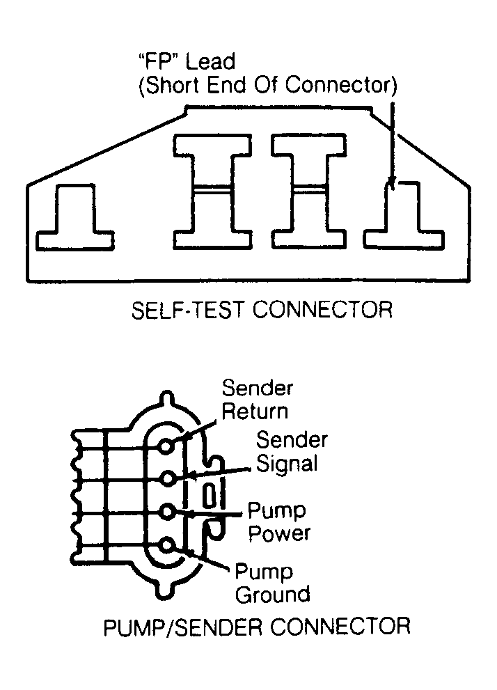 - If fuel pressure is zero, ensure battery is fully charged. Ensure connection is okay at pump/sending unit. Turn ignition off. Using a jumper lead, ground FP terminal at self-test connector. See Fig 1 . Turn ignition on, leaving engine off. Listen for sound of fuel pump. If pump is running, go to next step. If pump is not running, go to step 7).
