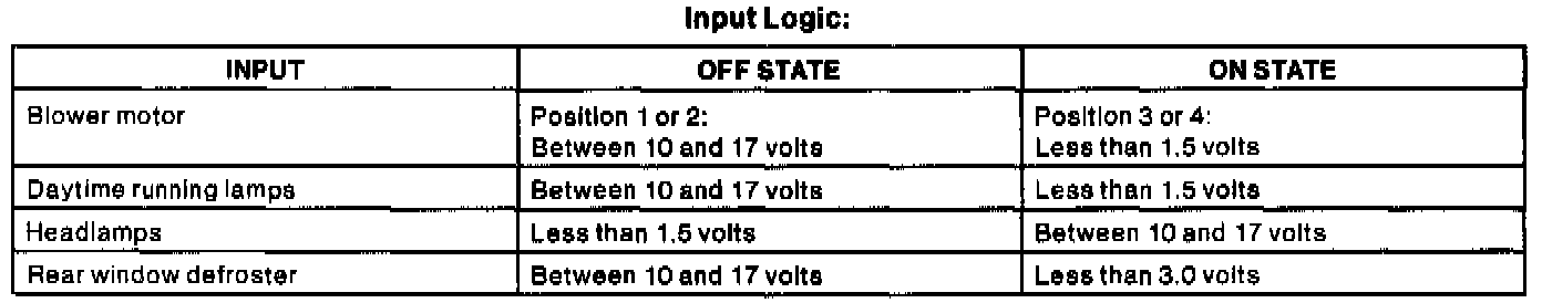 The electrical load inputs are used by idle speed control strategy to prevent idle speed fluctuations when loads are demanded or turned off by the driver. Four circuits are used by the processor to detect the ON and OFF status of the blower motor and daytime running lights (Canidian vehicles), the headlights and the rear window defroster.