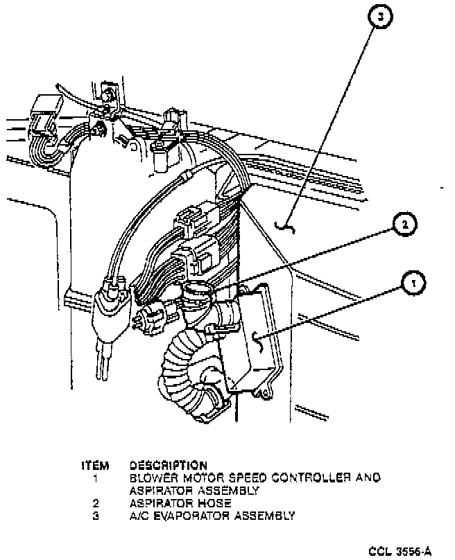 2. Working through the glove compartment opening, disconnect the electrical snap-lock connector and the aspirator hose at the blower motor controller. Also, disconnect the snap-lock connector from its mounting bracket.