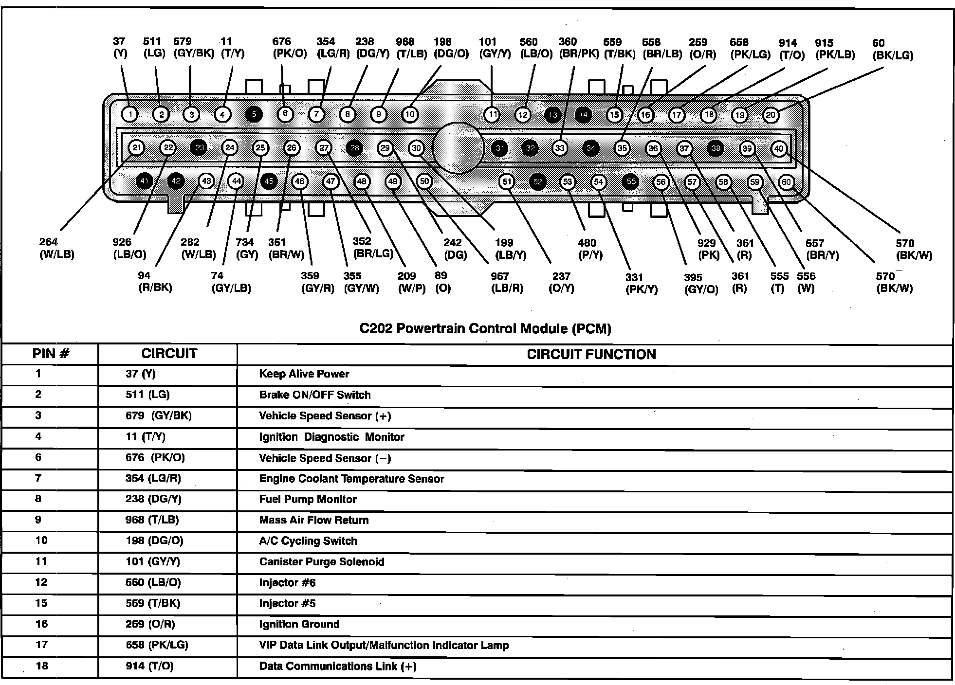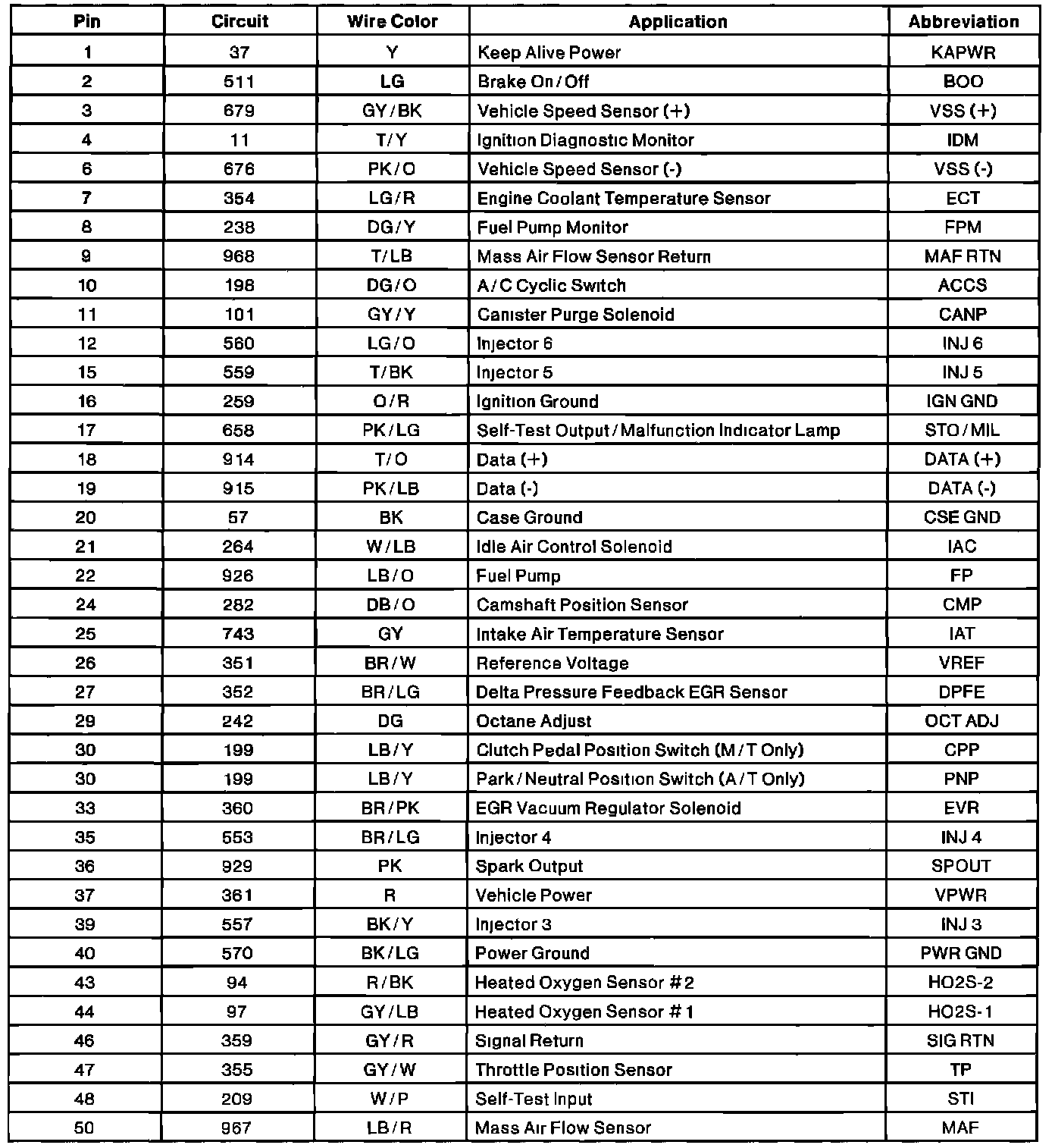 Powertrain Control Module (PCM) Connector Pin Useage:
