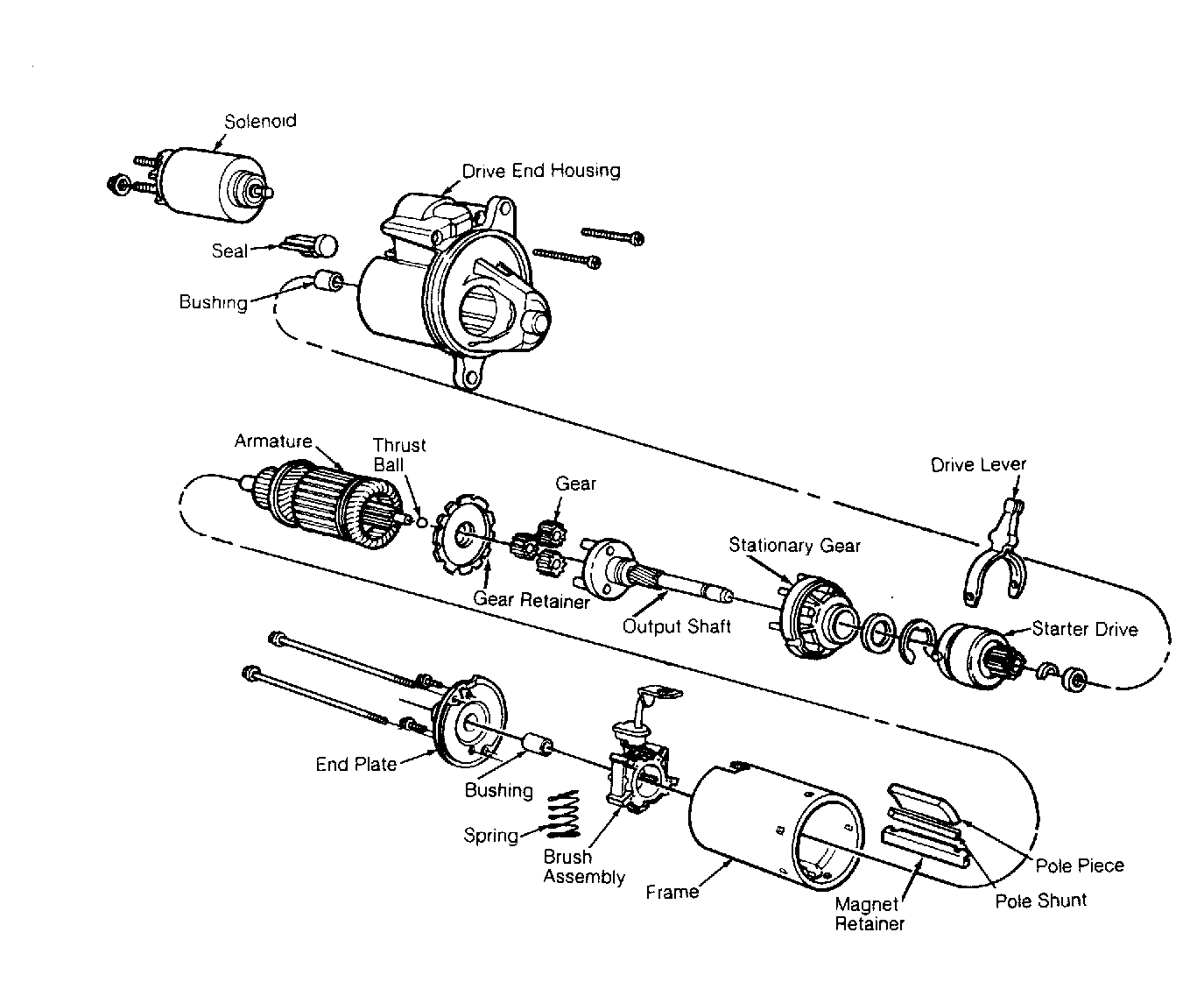 Connect battery, voltmeter, ammeter, and remote starter switch to starter. See Fig 1 . Engage remote starter switch. Starter should turn smoothly. Voltmeter should indicate 11 volts or more, and ammeter should indicate no more than 90 amps. If voltage is lower or current is higher than specification, disassemble starter and determine cause. See Figure .