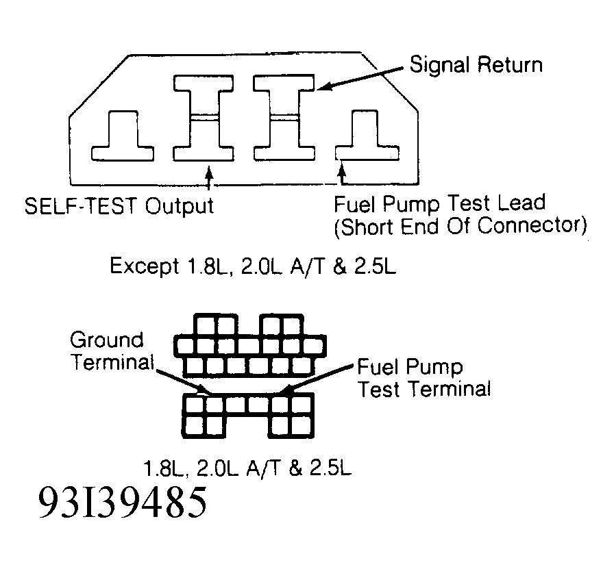1. Release fuel pressure. Install fuel pressure gauge. On all models except 1.8L and 2.0L A/T, connect a jumper wire between ground and fuel pump test terminal at the Data Link Connector (DLC). See Fig 1 . On 1.8L and 2.0L A/T, connect a jumper wire between ground terminal (Black wire) and fuel pump terminal (Light Green wire) at the Data Link Connector (DLC). On all models, turn ignition on, but DO NOT start engine. This activates the fuel pump.