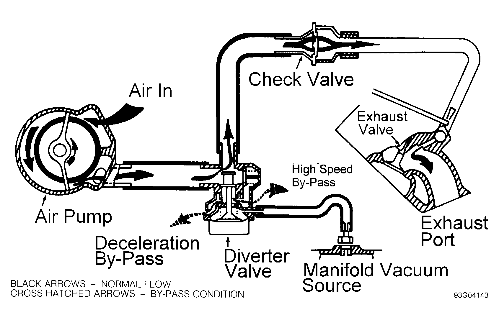 Check for missing or disconnected belt, check valve(s), diverter valve(s), air distribution manifolds, etc. Check air injection system for proper hose routing.