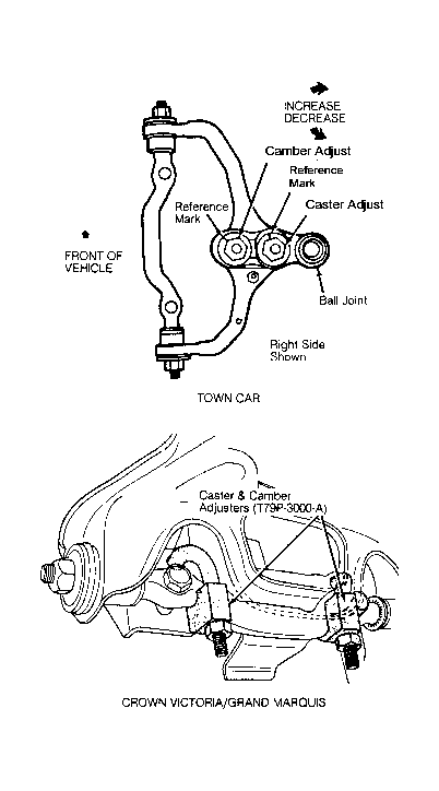 Adjusting cams are provided for camber/caster adjustment. See Figure. Loosen 2 nuts on top of adjusting cams. Turn hex cams to adjust camber/caster angle. Hold each cam and tighten nuts. Checking camber angle is not necessary after adjustment has been performed.
