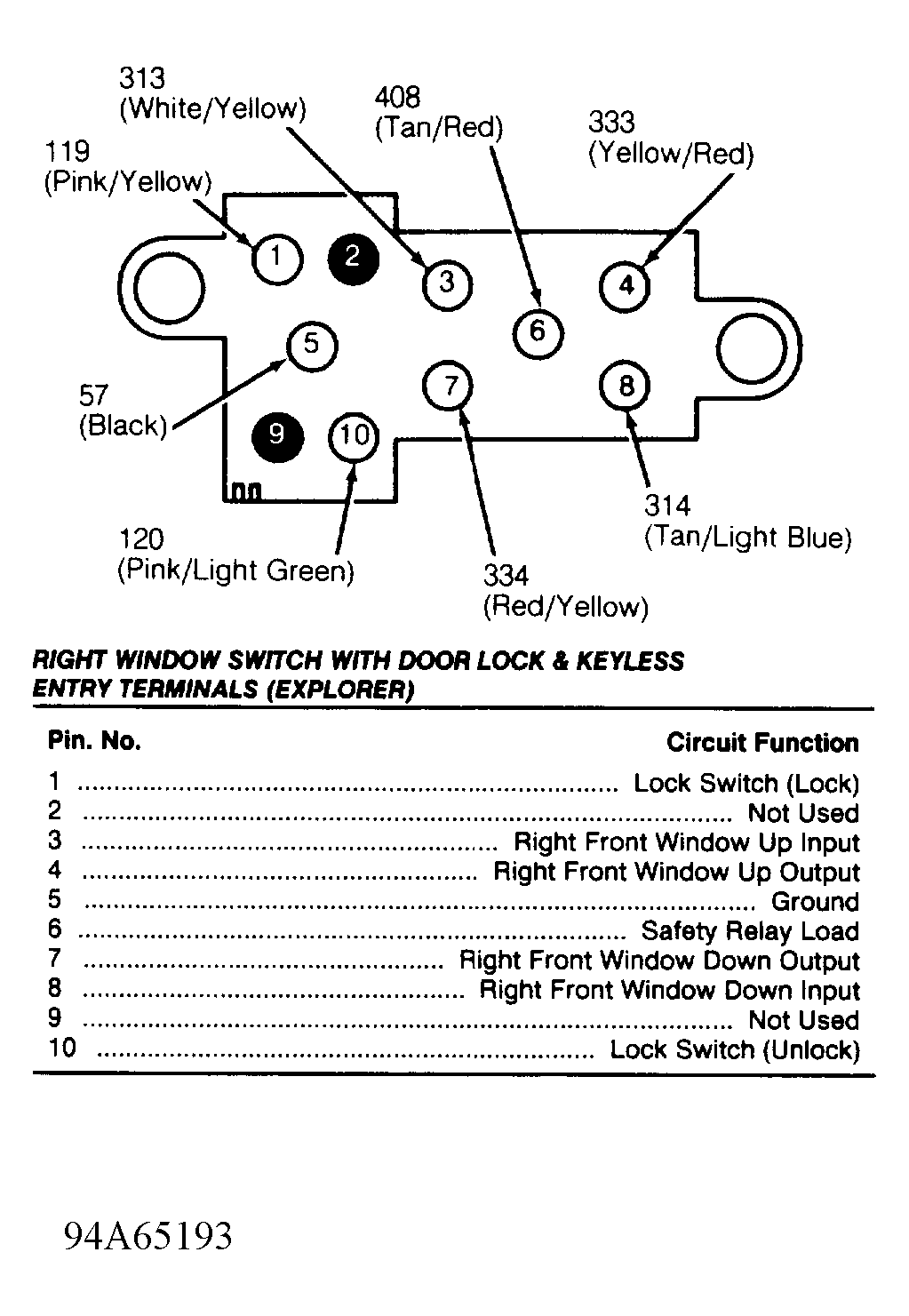 Testing information is not available from manufacturer. See illustration for right window switch with door lock and keyless entry terminal locations. See Fig 1 .