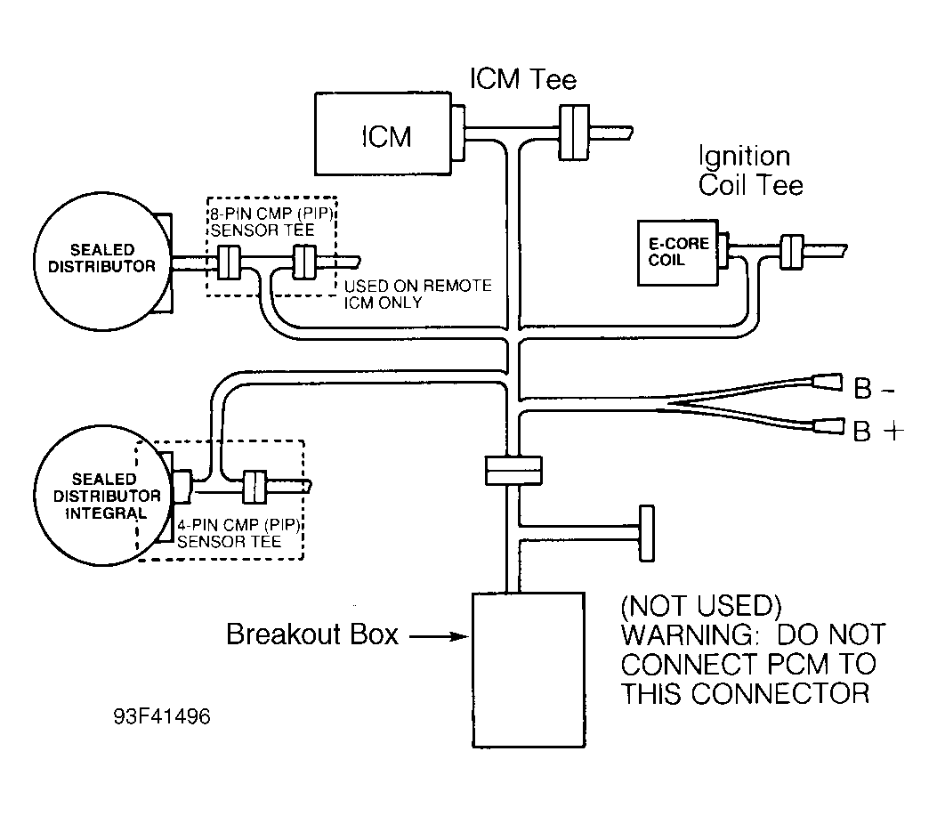 - Connect Test Equipment Turn ignition off. Connect DI Diagnostic Cable (007-00097) to EEC-IV Breakout Box (T83L-50-EECIV), negative battery terminal and ICM. See Figure . Leave B+ lead disconnected. Ensure PIP OPEN/NORMAL/SPOUT OPEN switch is in NORMAL position. Use DI overlay on breakout box. Disconnect PCM and go to next step.