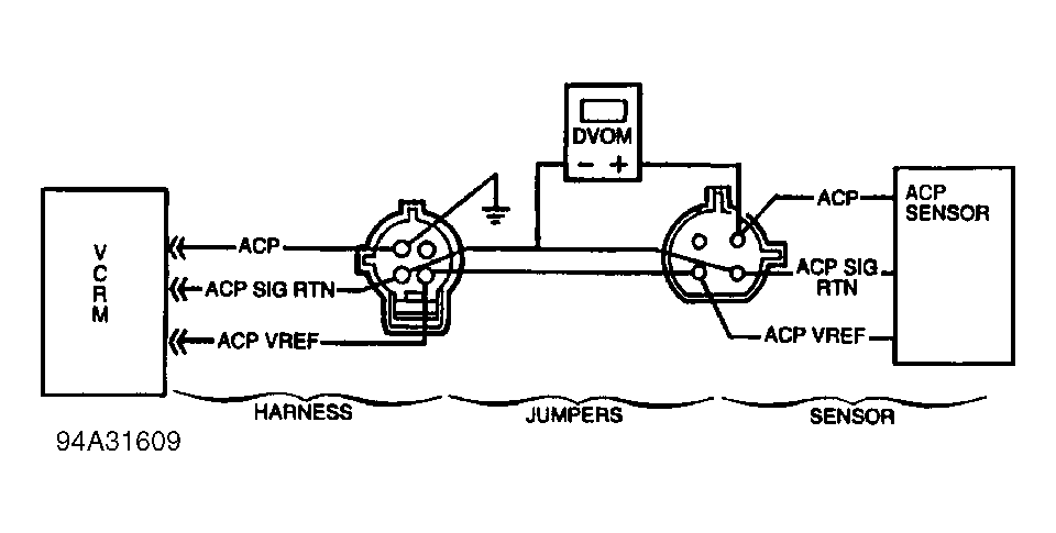 69) Check ACP Signal Circuit For Intermittent Open  Turn ignition off. Ensure ACP sensor is disconnected. Disconnect and inspect VCRM connector. Clean or repair connector as necessary. Using a DVOM, measure resistance of Dark Green/White wire between terminal No. 19 at VCRM connector and ACP signal terminal at ACP sensor connector. If resistance is 5 ohms or more, isolate fault and repair wiring as necessary. Reconnect all components. Clear continuous memory. Start engine. Turn A/C on and wait 20 seconds. Turn A/C and ignition off. Repeat QUICK TEST. If resistance is less than 5 ohms, observe DVOM, and shake, wiggle and bend ACP signal circuit (Dark Green/White wire) between ACP sensor connector and VCRM connector. If a fault is detected, DVOM reading will show 5 ohms or more, indicating an open circuit. If an open circuit is detected, isolate fault and repair wiring as necessary. Reconnect all components. Clear continuous memory. Start engine. Turn A/C on and wait 20 seconds. Turn A/C and ignition off. Repeat QUICK TEST. If an open circuit is not detected, fault is intermittent and cannot be duplicated at this time. Reconnect all components.