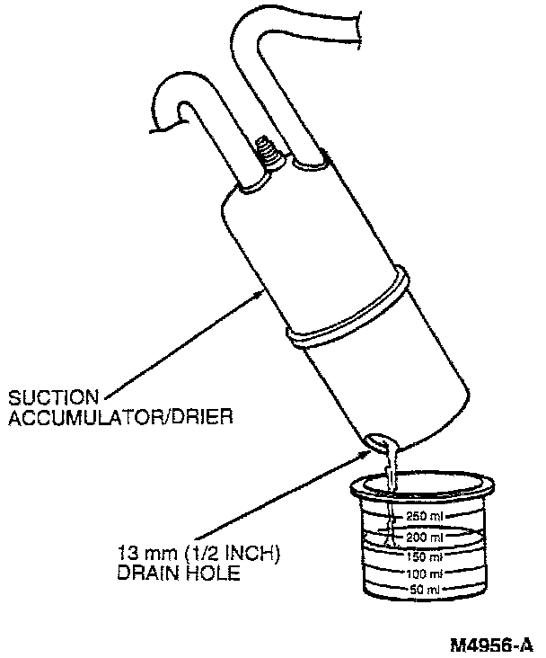 2. Remove the suction accumulator/drier assembly and drain the oil into a calibrated container.