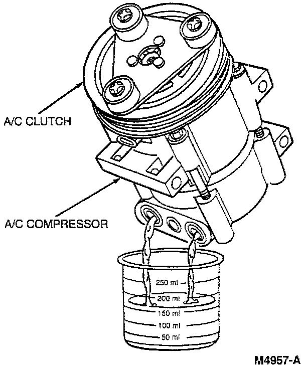 6. Remove the old A/C compressor and drain the oil into a calibrated container.