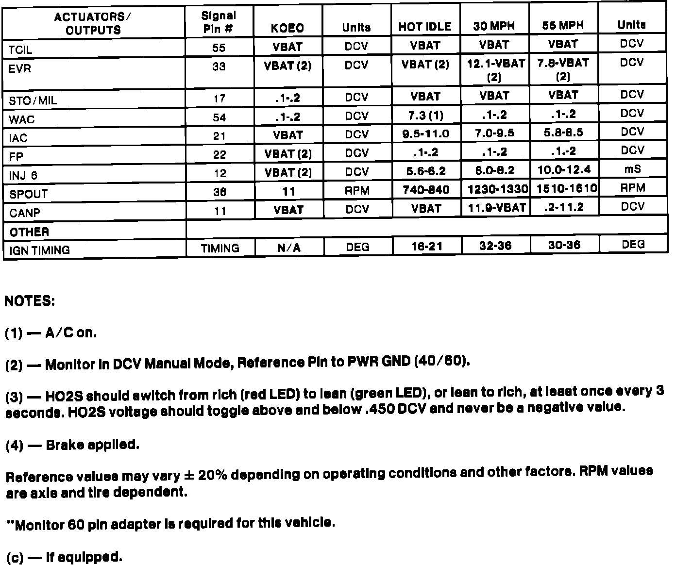 Some Electronic Engine Controls (EEC) devices such as Intake Air Temperature (IAT), Engine Coolant Temperature (ECT) are temperature dependent and values may vary. Other Values such as Idle Air Control (IAC) and Injector Pulsewidth (INJ) are calibration dependent and may vary also.