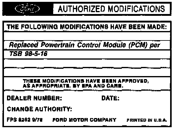 Obtain an Authorized Modification Decal (FPS 8262 - obtainable through DOES II, 25/pkg) and list the date, dealer number, and summary of modifications performed. Select a prominent place adjacent to the Vehicle Emission Control Information Decal suitable for installing the Authorized Modifications Decal. Clean the area, install the decal, and cover it with a clear plastic decal shield.