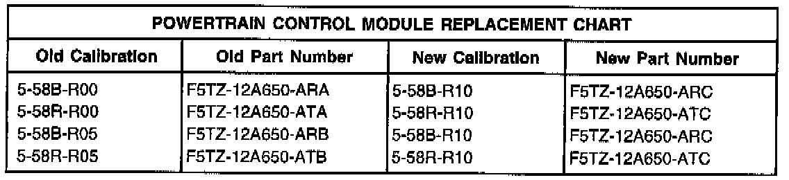 1. If a low frequency metallic noise occurs on heavy acceleration during the first kilometer/mile of operation, after cold start at ambient temperatures below 1000 (50°F), replace the PCM. Refer to the Application Chart for the correct service part numbers. Refer to the 1995 Explorer Service Manual, Page 03-14-9, for removal and installation of the revised PCM.