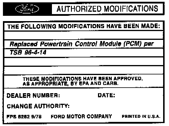 Obtain an Authorized Modifications Decal and list the date, dealer number, and summary of modifications performed. Select a prominent place adjacent to the Vehicle Emission Control Information Decal suitable for installing the Authorized Modifications Decal. Clean the area, install the decal. and cover it with a clear plastic decal shield.