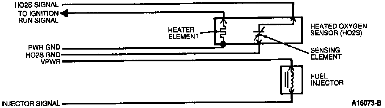 The Heated Oxygen Sensor (HO2S) reacts with the oxygen in the exhaust gases and generates a voltage based on this reaction. A low voltage indicates too much oxygen or a lean condition. A high voltage indicates not enough oxygen or a rich condition. The fuel injector is a typical on/off device. The amount of fuel delivered is determined by how long the injector is held open.