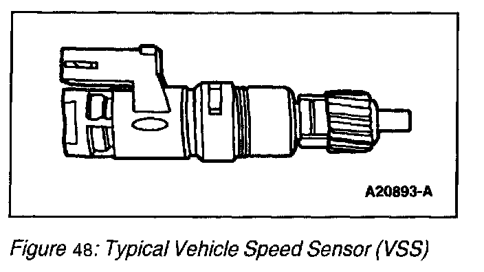 The VSS produces AC signals proportional to vehicle speed. This signal is sent to the PCM and is converted into a vehicle speed value, stored in RAM memory. The PCM utilizes this value to aid in controlling torque converter lock-up, coolant fan control, vehicle speed control, air/fuel ratio and ignition timing.
