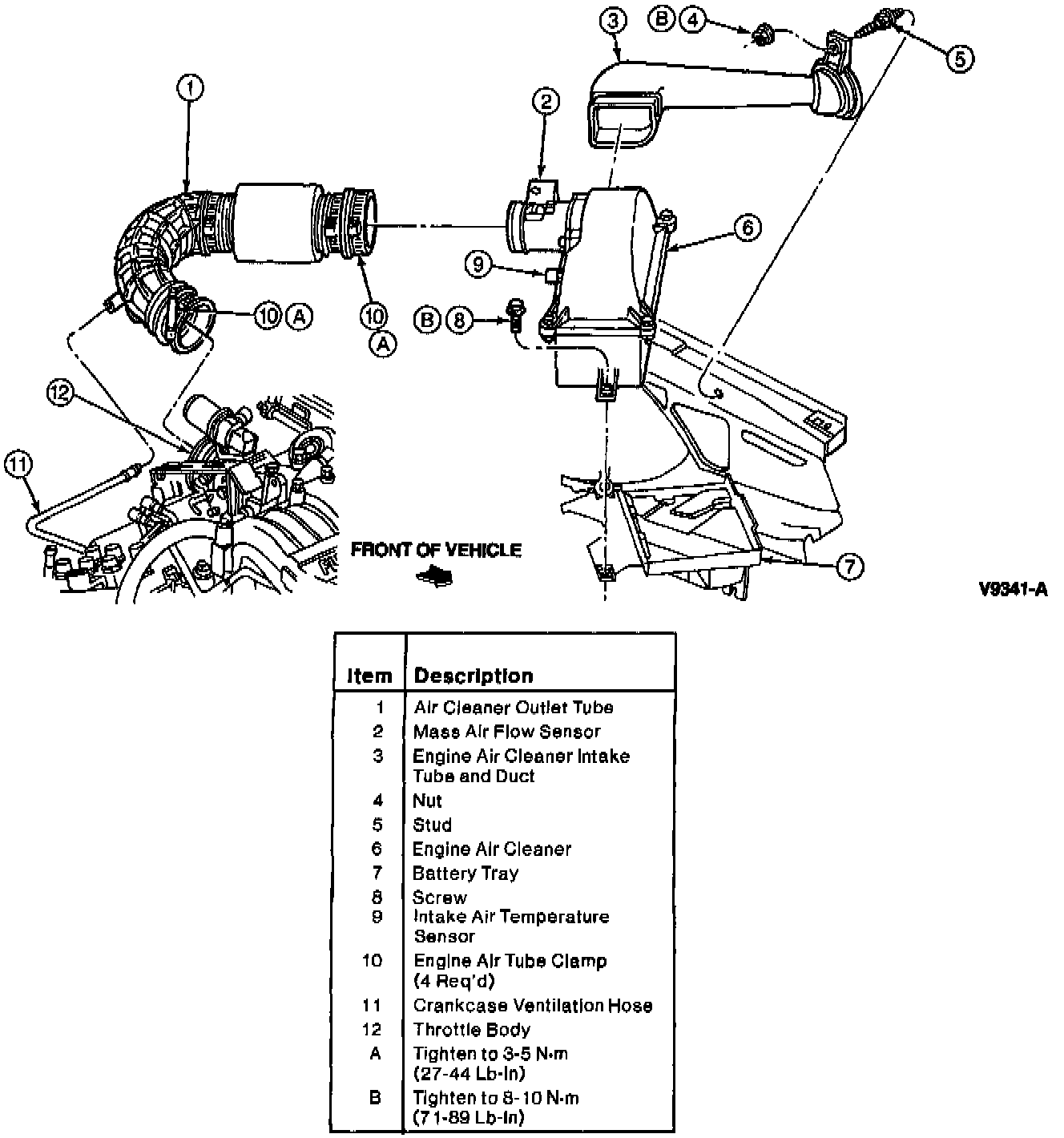 4. Install engine air outlet tube to mass air flow sensor and throttle body. Tighten retaining clamp to 2-3 Nm (18-27 lb in).