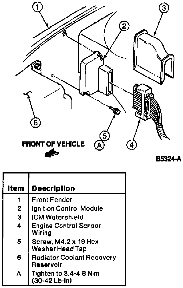 4. Remove ignition control module lower retaining screw and ignition control module from the RH front fender apron.