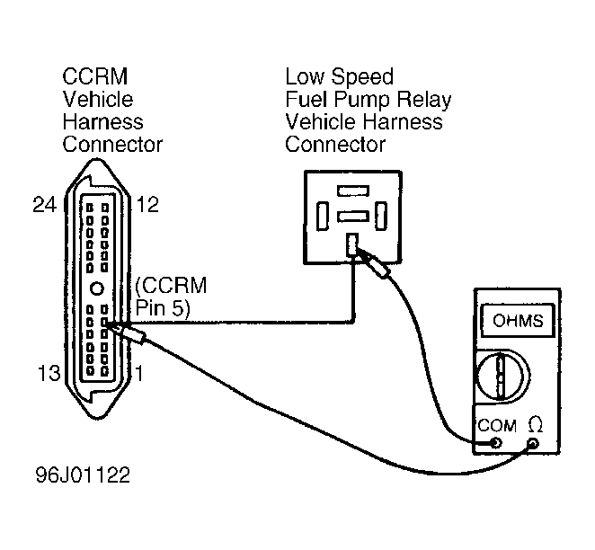 - Step 182) Check Power-To-Pump Circuit Continuity Leave ignition off and CCRM disconnected. Disconnect scan tester, if applicable. Measure resistance between CCRM wiring harness connector terminal No. 5 and negative battery terminal. If resistance is less than 12 ohms, replace CCRM and re-evaluate symptom. If resistance is 12 ohms or more, repair open in POWER-TO-PUMP circuit between CCRM and FPM splice and repeat QUICK TEST .