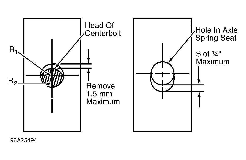 - If thrust angle is 0-.3 degrees, modify spring center bolt on side which axle must be moved. Grind and radius head of center bolt to match radius of hole in spring seat. See Fig 1 .