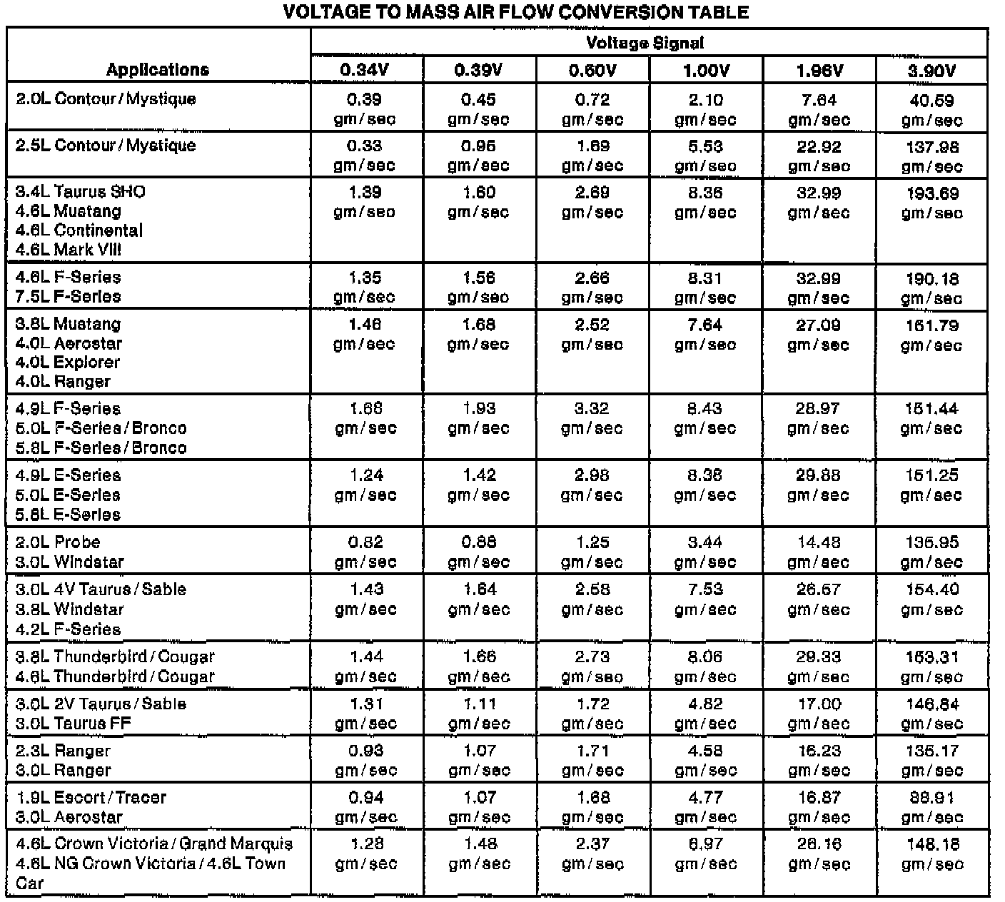 Voltage To Mass Air Flow Conversion Table: