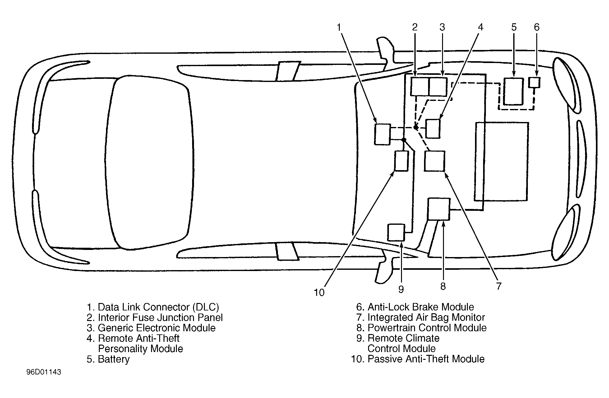 The data bus lines are routed throughout the vehicle to each module as a common "bus" or party line where all modules share information. See Fig 1 . Information on data lines is transmitted in a pulse width type code. Any module can transmit or receive information equally, there is no "master" module. If more than one module attempts to send information at the same time, the message with highest priority is given network access first. This addressing scheme is known as Standard Corporate Protocol (SCP).