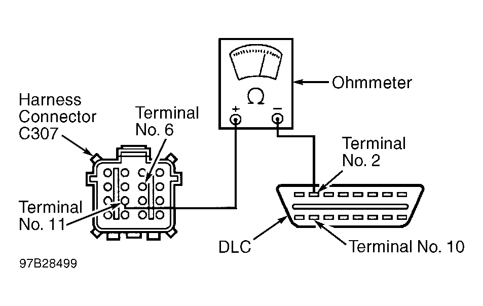- Using ohmmeter, check resistance between terminal No. 10 (Pink/Light Blue wire) on DLC and terminal No. 6 (Pink/Light Blue wire) on female side of harness connector C307. See Fig 2 . Note resistance and go to next step.